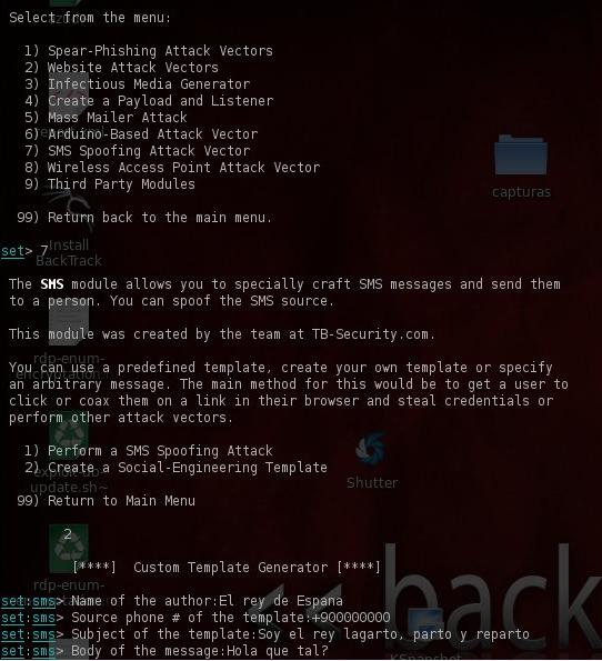 Vamos a jugar un poco con SET. La idea es sencilla, mandar un SMS a un empleado de la empresa a la que queremos auditar, diciéndole que ingresen en una página ( que previamente habremos preparado para infectar, concienciar, etc) haciéndonos pasar por alguien de la empresa o cercano a ella.