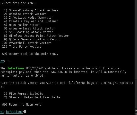 Ejecutamos la opción 1 de Social- Engineering attacks. A continuación usamos la opción 3, Infectious Media Generator