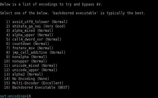 A continuación nos pregunta por el tipo de codificación que queremos aplicarle al backdoor para evadir los antivirus/ids.