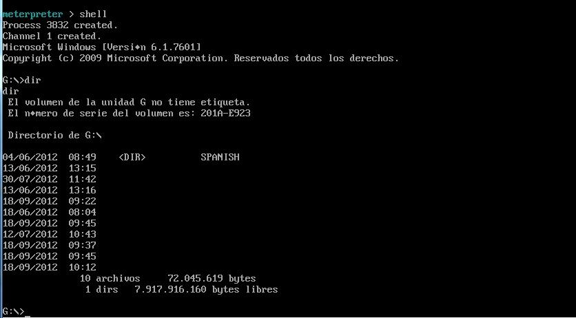 Ejecutamos por ejemplo una shell, y listamos el contenido del disco, en mi caso el usb desde donde he ejecutado el fichero.
