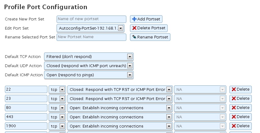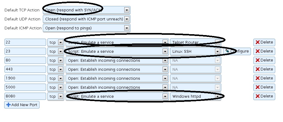 Desde la pestaña de profiles modificamos la configuración propia del honeyd para esa emulación.