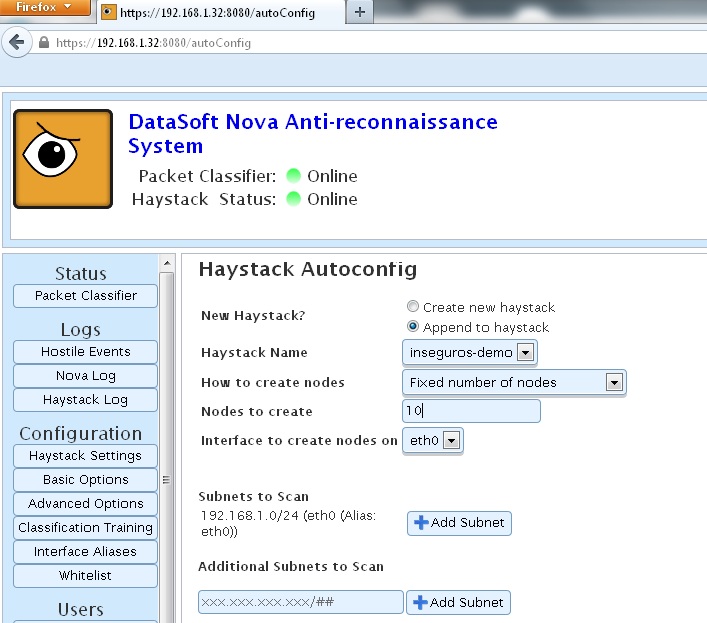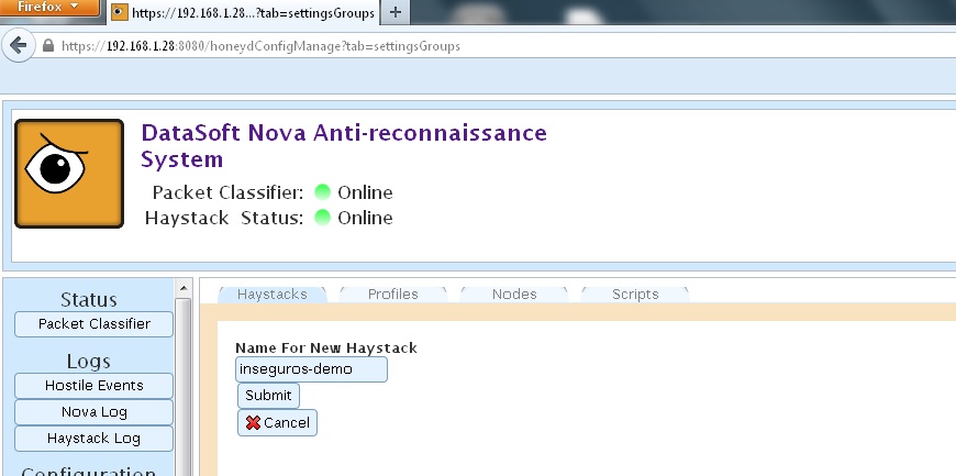 Después pasamos a configurar manualmente Haystacks, la lista de máquinas emuladas mediante honeyd. Añadimos un grupo de máquinas nuevo.