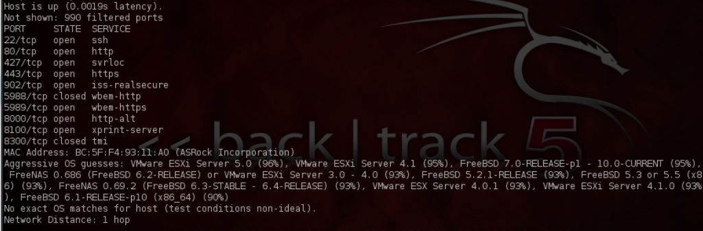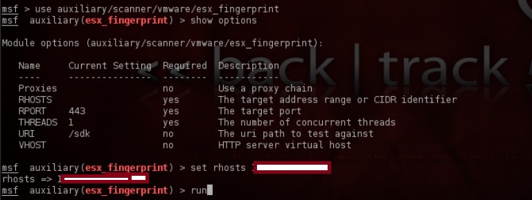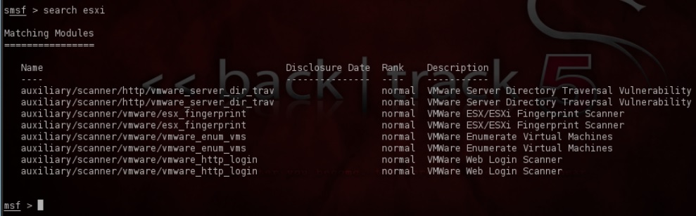 De momento no he podido tapar mucho el equipo, pero voy a repasarme Metasploit por si puedo jugar un rato y probar alguna vulnerabilidad. Para ello, como no tengo mucha memoria, entro en Metasploit en mi máquina Backtrack y hago «Search esxi» para ver los módulos.