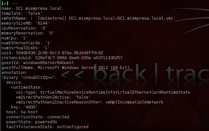 Puesto con Metasploit, lanzo otro módulo que trata de enumerar las características de las máquinas virtuales instaladas sabiendo el password. No es muy atractivo como herramienta de explotación pero si post-explotación en un supuesto de penetrar en un sistema y conseguir la clave. Si estás en una sesión mediante Pivoting no tienes a mano el Client gráfico.