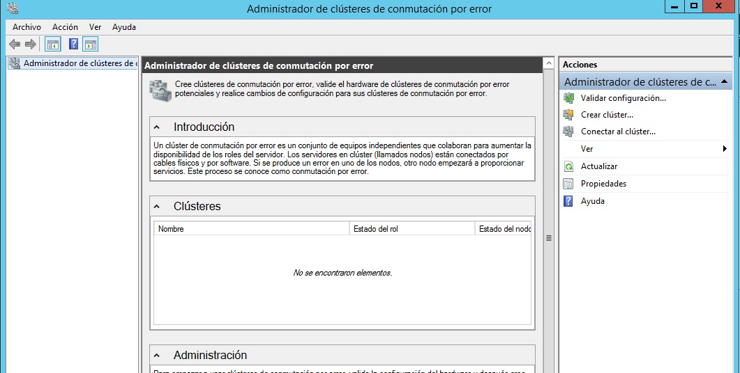 Una vez tenemos instalados los sistemas base, en el primer nodo, en mi caso SqlServer1 (x.x.x.200) entramos en el complemento de administración del Cluster.
