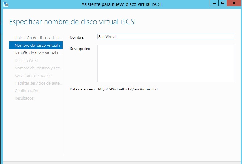 Una vez instalado, entramos en el complemento de administración de Ficheros y Almacenamiento, y sobre la parte iSCSI, creamos un nuevo disco duro virtual SCSI.