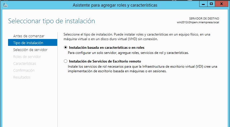 Lo primero que tengo que hacer en mi caso es instalar Hiper-V en un servidor Windows 2012 R2 que corre sobre VMWare Esxi 5.1, es decir, instalar un Hipervisor dentro de otro, Virtualización anidada.