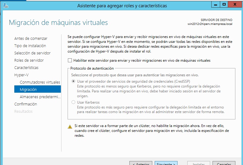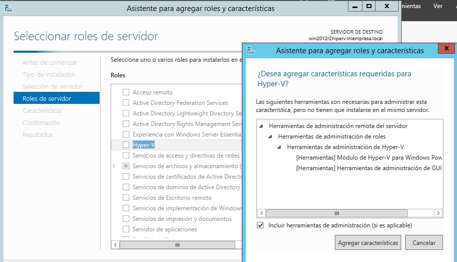 Ahora ya puedo instalar el Role de Hiper V en la máquina virtual Windows Server 2012 R2.
