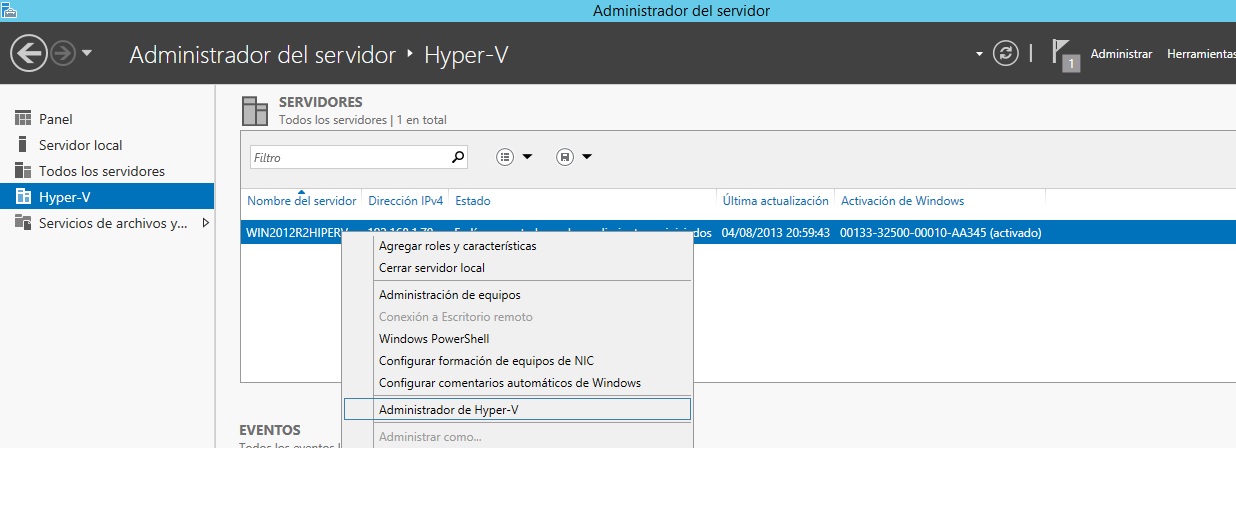 Una vez instalado el Role de Hiper-V entramos en el complemento de administración. Podemos hacerlo como siempre de dos maneras. En el panel central, botón derecho o en Herramientas, como en todos los complementos en Windows Server 2012 R2.