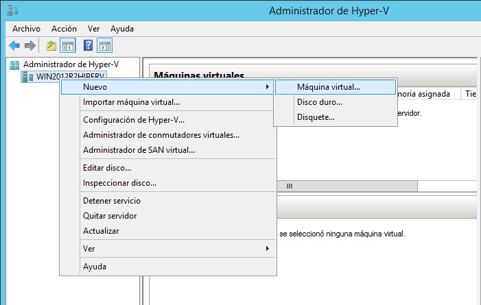 Nos ubicamos en la raíz del servidor de Hiper-V a la izquierda y botón derecho, nueva máquina virtual.