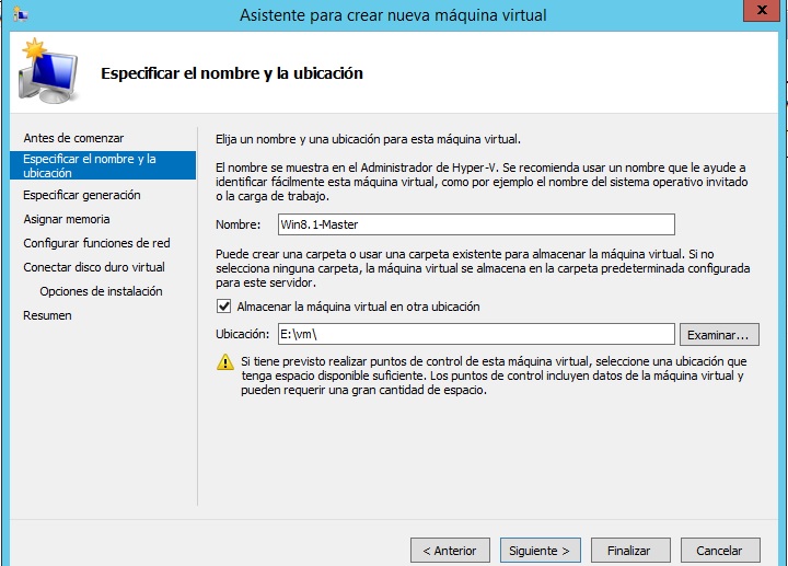 No olvidemos indicar la ruta creada previamente para almacenar la configuración de máquina virtual.