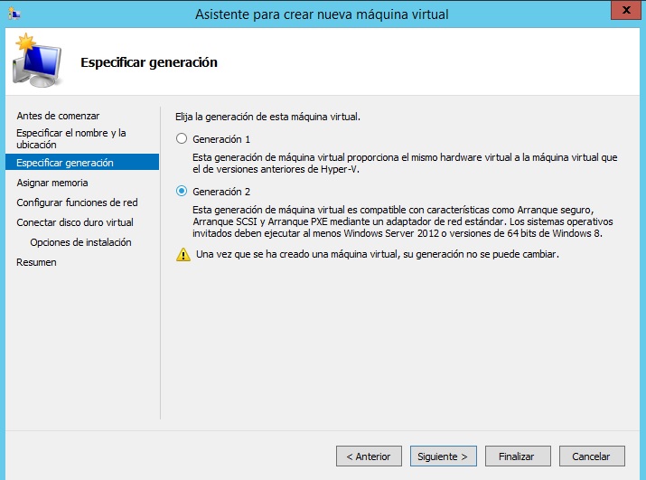 El siguiente paso es seleccionar que tipo de máquina virtual vamos a crear, Generación 1 o Generación 2.