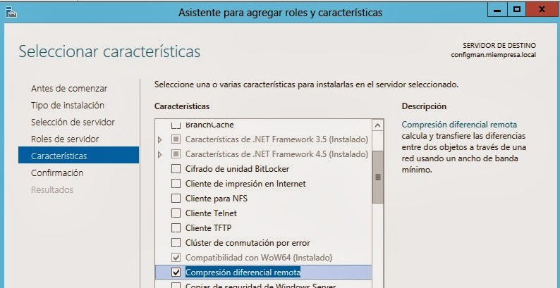 Ahora instalamos la función Compresión diferencial remota (RDC), desde el administrador central de Windows 2012 R2 y el servicio BITS.