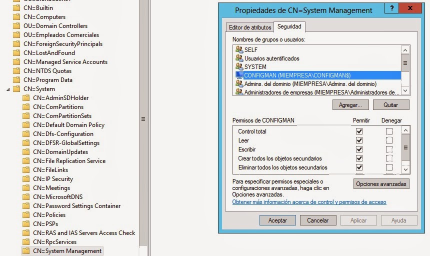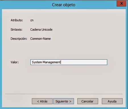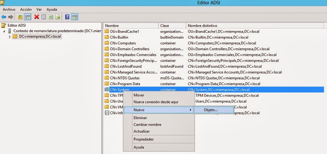 Independientemente de extender el esquema o no, debemos crear una carpeta contenedora en Active Directory, bajo la rama SYSTEM para SCCM 2012. Lo podemos hacer desde el editor ADSI.