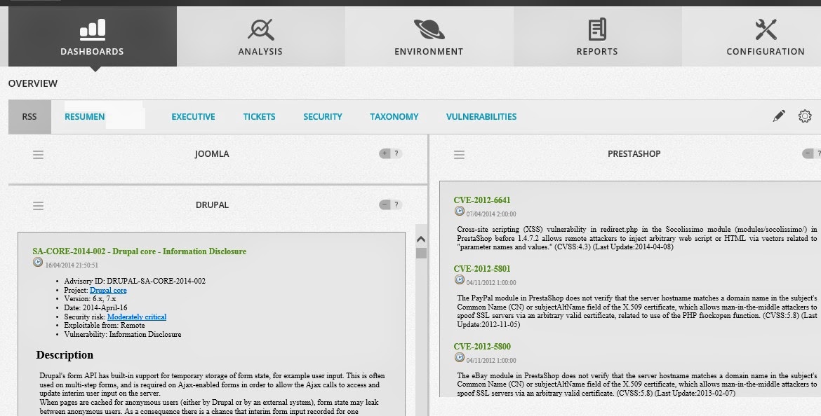 Por último vamos a añadir una pestaña RSS. Esto es un Widget que agregamos con una fuente RSS. El propósito para mi es aglutinar en un solo sitio todas las fuentes de todos los sistemas que tengo instalados, y que me interesa estar al día en cuestiones de avisos de seguridad. Para ello creo que te será útil el post Crear fuente RSS personalizada.
