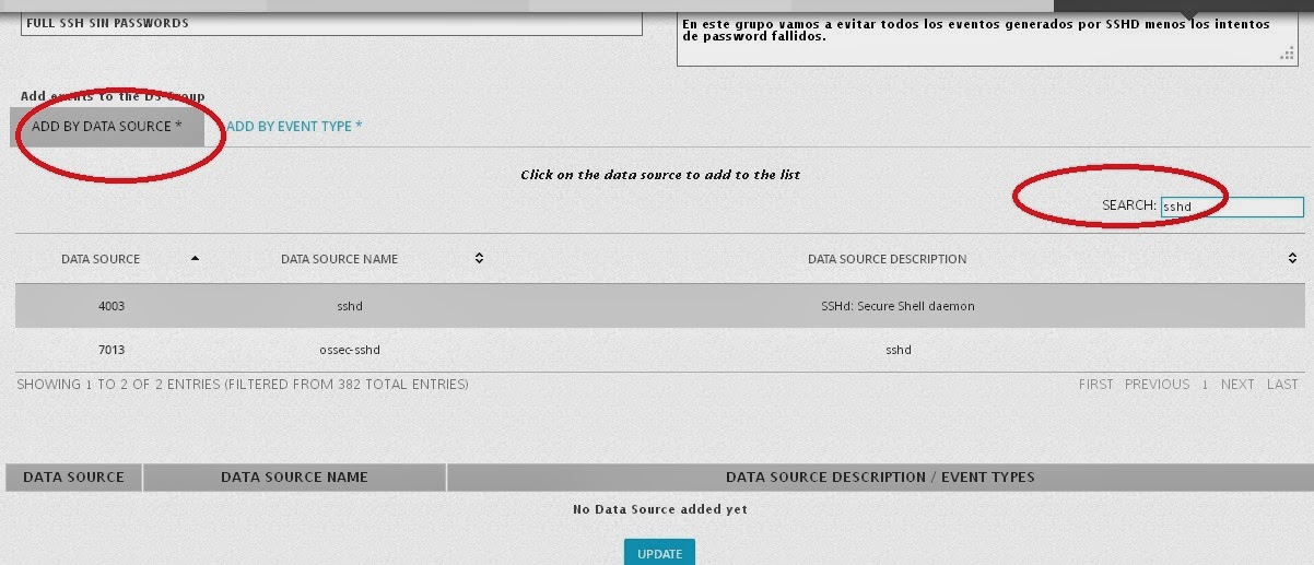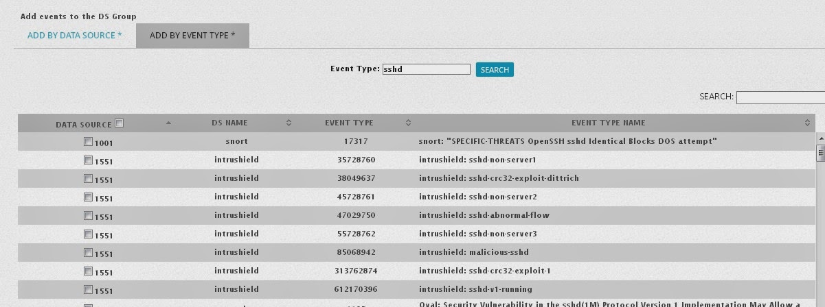 Ahora configuramos los eventos. Podemos seleccionar eventos por su taxonomía, por la categorización que tienen, o bien por fuentes de datos o DS (data sources). Vamos a crearnos una fuente de datos específica para el componente SSHD.
