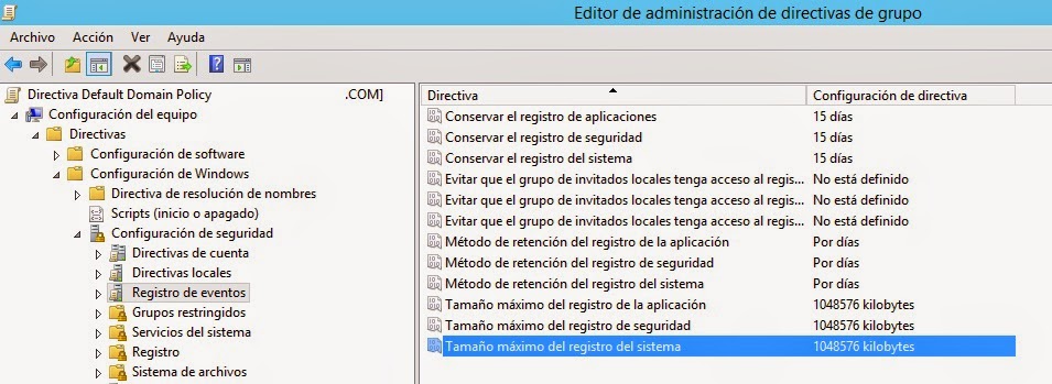 El siguiente paso es habilitar un tamaño aceptable al log, a los registros del Visor de Eventos.