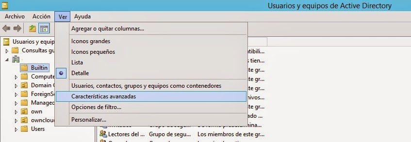 Accedemos a Usuarios y Equipos de Active Directory y habilitamos las opciones avanzadas.