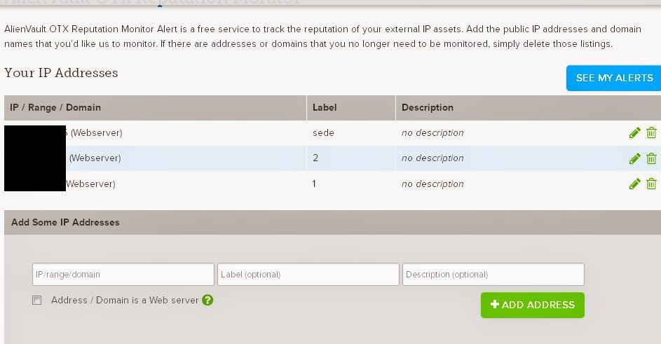 El segundo uso que vamos a comentar es la monitorización de nuestros servicios IP en la base de datos. Esto quiere decir que añadimos nuestros equipos públicos, y configuramos una alerta para que en el caso de ser introducidos, por ejemplo por la presencia de malware en algún equipo que está «trabajando internet», el servicio nos envíe una alerta para poder gestionar la inclusión.