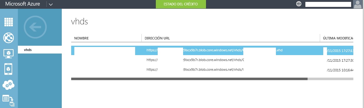 Ahora en el portal de administración de nuestro Azure debemos anotar la url de nuestro portal de almacenamiento y nuestro contenedor, algo así como: https://pvportalvhd* *****xcx9b7r.blob.core.windows.net/vhds
