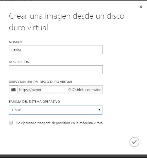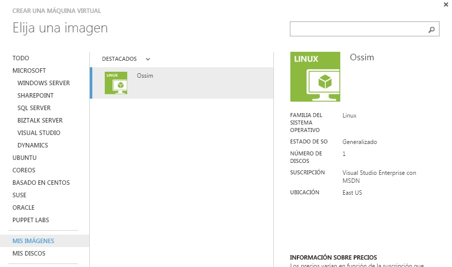 Una vez terminado el proceso de subida del disco, debemos configurar en Azure una nueva imágen, en la que añadimos un disco duro. Sería como una plantilla. Una vez tenemos la imágen creada, iniciamos el proceso normal de creación de una máquina virtual, seleccionando desde nuestras imágenes la distribución que acabamos de subir, en este caso OSSIM de AlienVault.