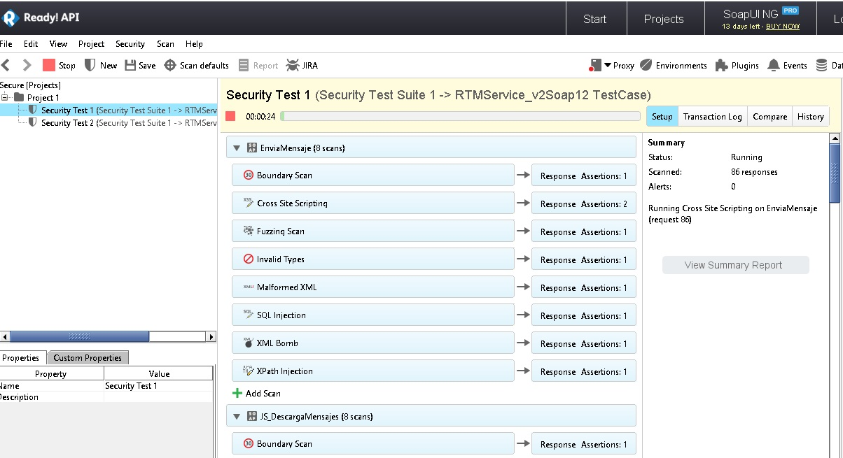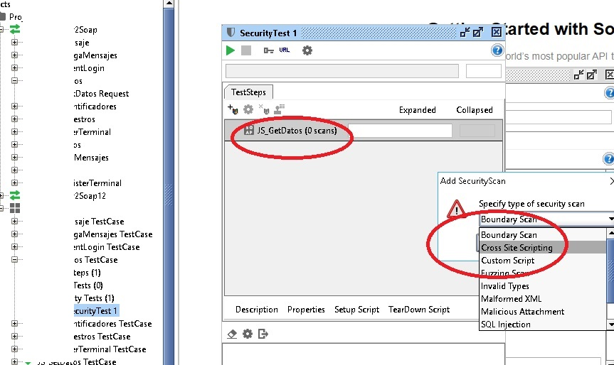 Al estilo de Burp, podemos ver las peticiones, modificarlas, ver respuestas y mil cosas más. Lo que lo hace interesante es que la herramienta implementa test de pruebas con muchas opciones, algunas orientadas a la seguridad. El procedimiento detallado en imágenes es muy sencillo. Cargamos la descripción del webservices, cargamos las opciones por defecto las pruebas de seguridad, y vemos que hace la herramienta por si sola.