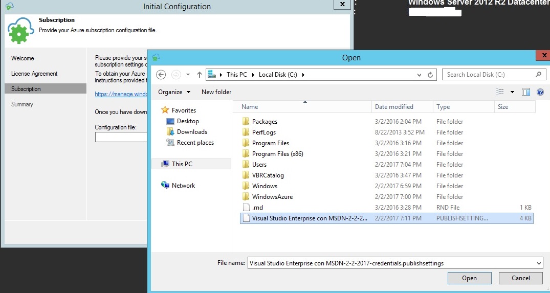 Tu tienes tu Veeam backup funcionando en tu sede. Te registrar en Azure, ya de primeras tienes 170€ en la cuenta para ti, GRATIS. Bien. Nos descargamos un appliance configurado de Veeam que se denomina Direct Restore to Azure. A los 5 minutos tendrás una máquina 2012 con una instalación de Veeam a tu disposición. El primer paso es configurar la instalación y añadir tu fichero de configuración de Azure dentro de la máquina.