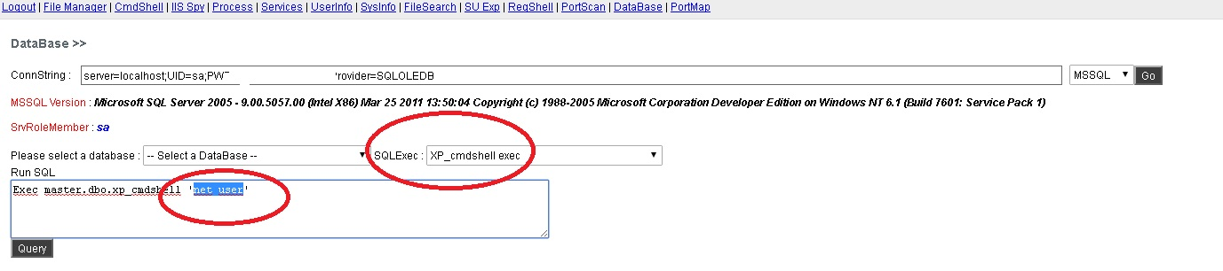 Con la amabilidad que presenta esta webshell, me conecto al Sql Server y ejecuto un cmd_shell, que está vez si está habilitado, pero qué con la misma web shell tenemos la opción para habilitarlo si no lo estuviese, para eso somos SA xD.