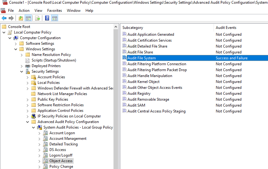 Para ello nos vamos a nuestro Windows a defender, habilitamos las opciones de auditoría avanzadas, y en concreto, la auditoría de acceso a ficheros tanto correcta como incorrecta.