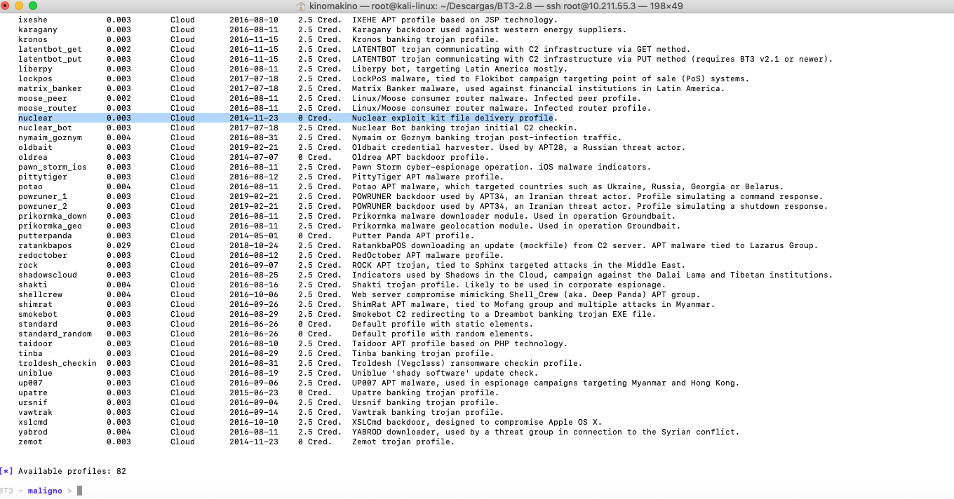 Seteamos el servidor que hará de C2 con la ip indicada y hacemos un show profiles. Veremos la lista de perfiles de imitación que tenemos disponibles, con la salvedad de que algunos son de pago, 1$ creo recordar que cuestan, pero vamos a elegir uno gratuito, que es gratis xD.