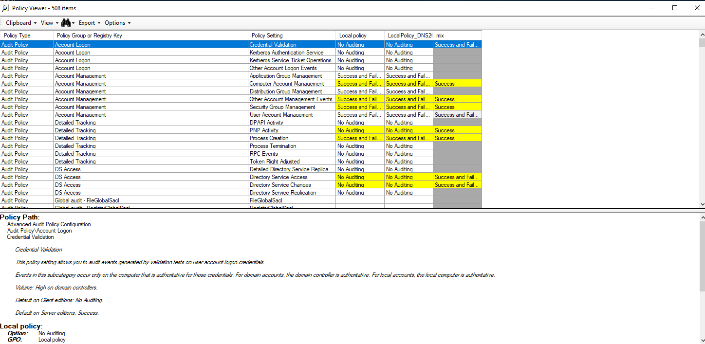 Pero seguro que esto te da rollo, a mi me lo da. Mejor será tener una herramienta por ejemplo, Policy Analyzer dentro del kit, que le pases varias GPO´s, y te muestre en amarillo los cambios puntuales, para re-comprobar qué estás cambiando…
