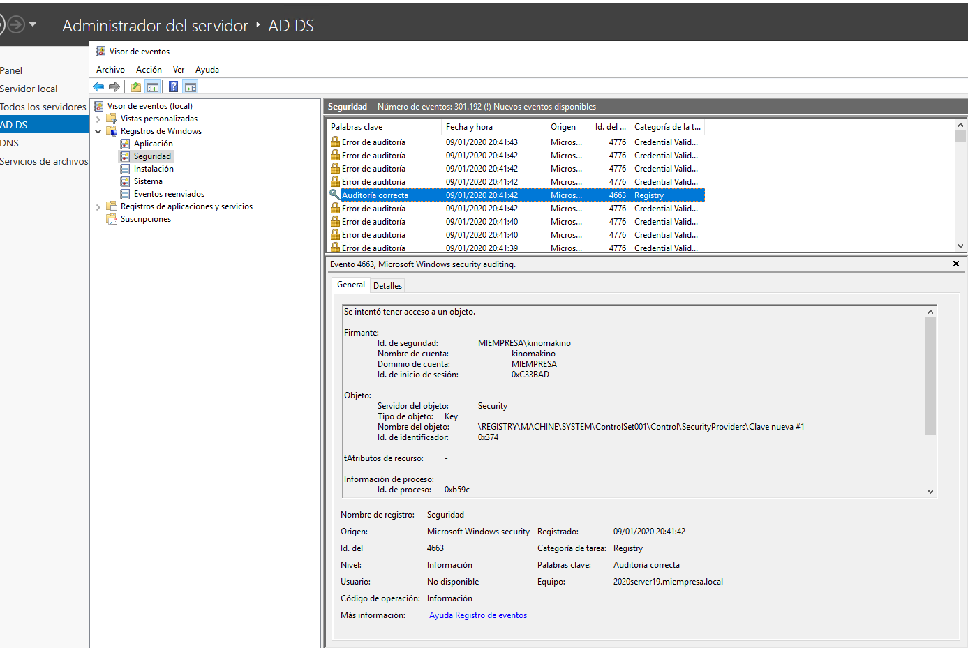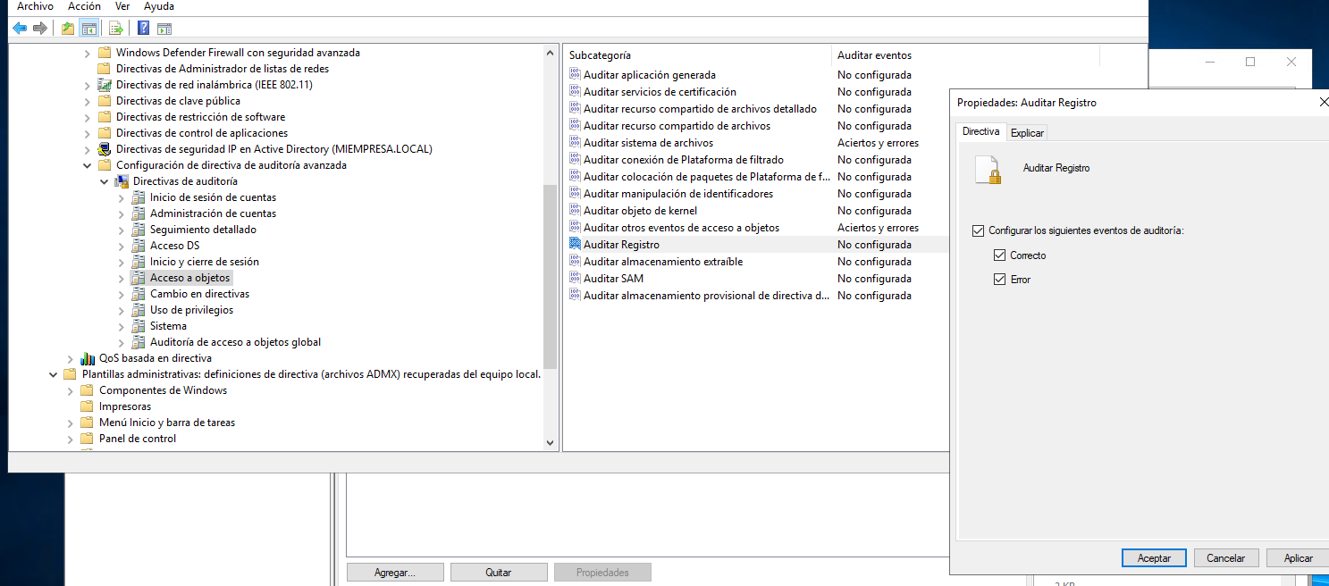 Entonces, al lío. Como cualquier elemento de auditoria en sistemas Microsoft, hay dos partes: decirle al sistema que vamos a auditar acceso y/o error en el registro; el segundo paso es identificar qué ramas del registro queremos auditar.***** esto es igual para TODO en Active Directory******