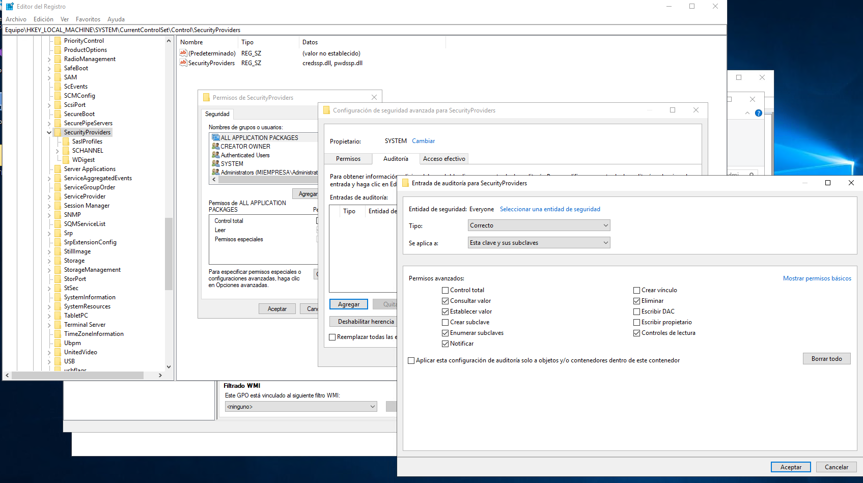 Ahora vamos a la rama del registro que queremos auditar y seteamos la configuración, es decir, que para TODOS, audite el uso de estos permisos.