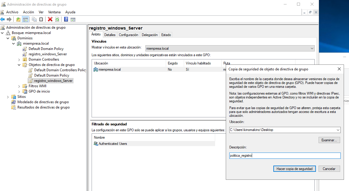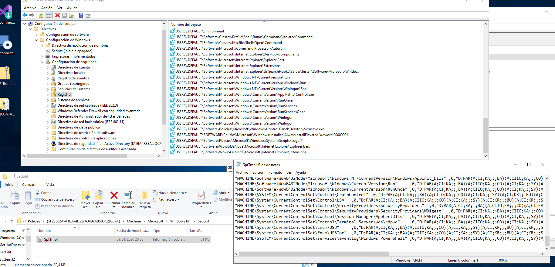 Localiza tu GPO en SYSVOL, en mi caso estaba aquí: miempresa.localSYSVOLmiempresa.localPolicies{5F23582A-A1BA-4D22-A34B-AB5B3C29307A}MachineMicrosoftWindows NTSecEdit