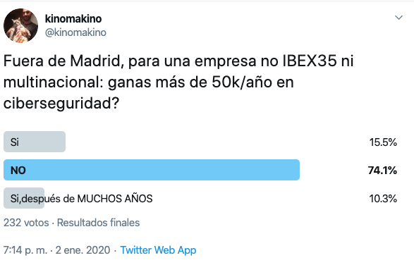 Con una carrera más o menos lanzada, de 10 años, cobrar alrededor de los 45.000 euros creo que es habitual, pero ya en las provincias no. En la inmensa mayoría de España no. Por el coste de vida, y por el tipo de empresa. Os voy a poner un ejemplo, en Murcia, no hay empresa que tenga un CISO. NINGUNA. Hay CIO`s, pero CISO´s como tal exclusivo NO, porque hay unas 10/20 empresas que quizás lo necesiten, pero aún no hay madurez. En Alicante igual, en Albacete igual… Málaga… Córdoba… Gijón… A Coruña… Quitando ibex 35 y grandes grandes grandes empresas, no hay puestos de CISO, ni mucho menos de técnicos que cobren más de 45k.