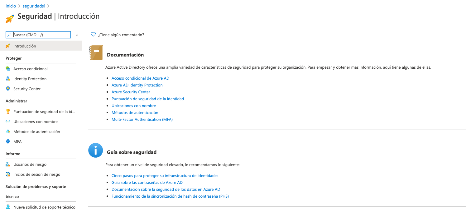 Ahora es el turno del objetivo principal del post, configurar la seguridad para las contraseñas. Accedemos al portal de AD en Azure y entramos en la sección seguridad.