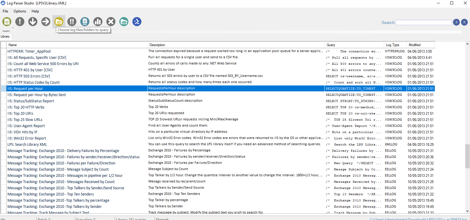 La herramienta tiene un manejo muy sencillo, cargamos el fichero y tenemos a nuestra disposición consultas preconfiguradas o podemos realizar las nuestras. Vamos a realizar una prueba sencilla pasándole un fichero de logs de IIS y realizando una consulta de número de peticiones por hora.