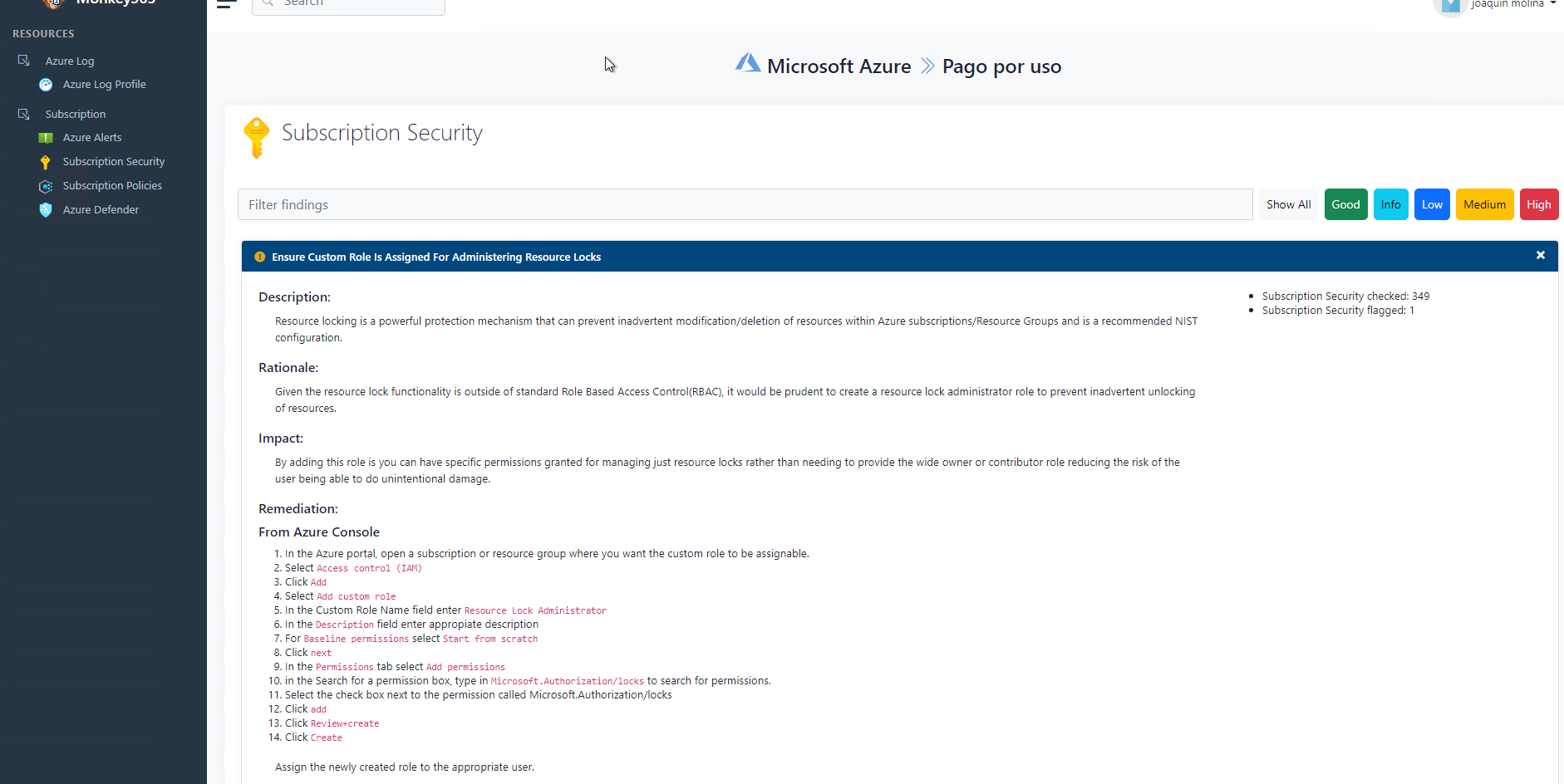 En otras ocasiones, por ejemplo mirando configuraciones de la suscripción, vemos como incluso nos aparece una guía de resolución del hallazgo.