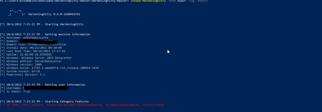 Import-Module .Invoke-HardeningKitty.ps1 Invoke-HardeningKitty -Mode Audit -Log -Report