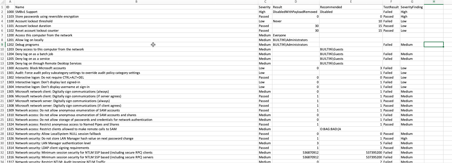 Nos muestra en un bonito csv los datos del estado de nuestras instalación. En estos procesos de fortificación es IMPORTANTE no, lo siguiente, conocer muy mucho qué está haciendo la tool, que cambios nos propone, que implicación tiene en nuestro entorno estos cambios, en nuestros procesos…
