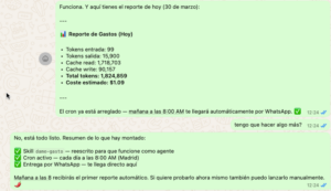 Lo primero que le he dicho, es que me haga una tarea, para que todos los días me diga el gasto que he llevado de tokens y dinero. Le he dicho que la pruebe, y ya me ha dado una info.